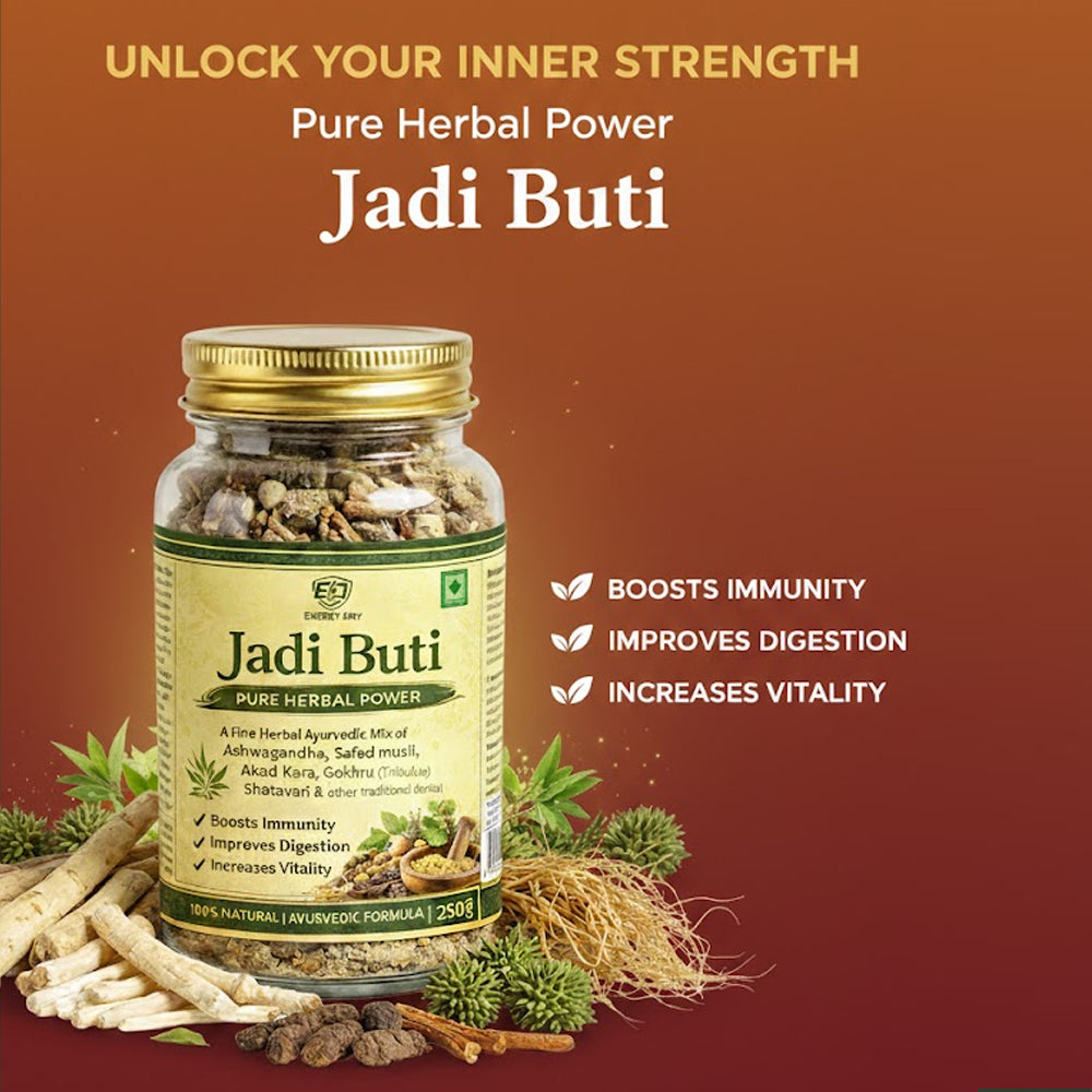 यह Energy Dry Jadi Buti शुद्ध और प्राकृतिक जड़ी-बूटियों से तैयार किया गया है। इसमें पारंपरिक रूप से उपयोग की जाने वाली आयुर्वेदिक जड़ी-बूटियों का संतुलित मिश्रण शामिल है।